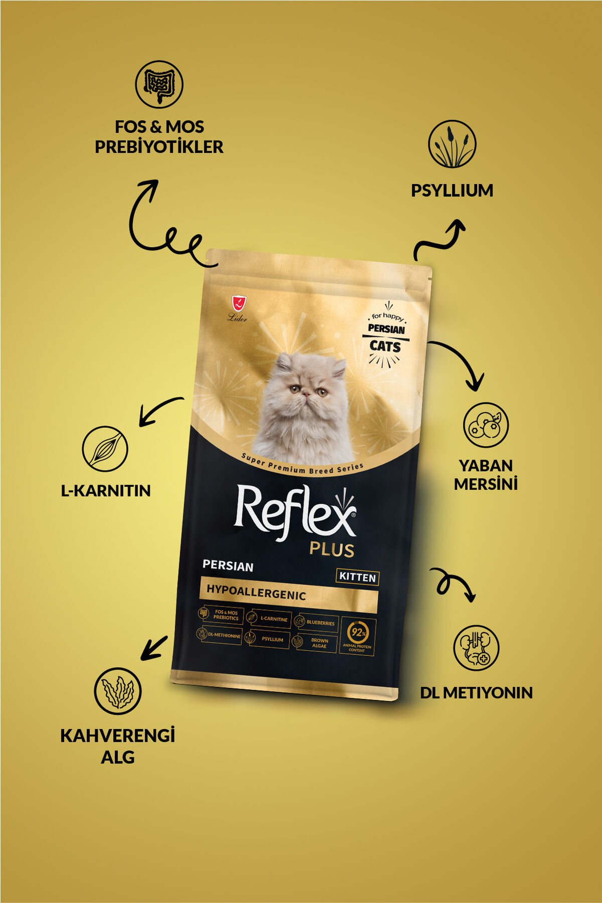 Reflex Plus Persian Yavru Kedi Maması 1,5 Kg 2-12 aylık, Persian ırkı yavru kedilere uygun tam ve dengeli formüle edilmiş, süper premium kuru kedi mamasıdır.; Fos & Mos Prebiyotikler : Bağışıklık ve sindirim sistemi sağlığının korunmasında olumlu etki gösteren doğal katkı maddesidir.; L - Carnitine : Enerji metabolizmasında görev alan bir aminoasittir.; Yaban Mersini : Antioksidan içeriğe sahiptir.; Bağışıklık sistemini ve üriner sistem sağlığını destekler.; DL-Metiyonin : İdrar yolu sağlığını desteklemeye, idrar pH'ını düzenlemeye ve idrar kristallerinin oluşumunu azaltmaya yardımcı olur.; Psyllium : Bağırsak hareketlerinin düzenlenmesine ve tüy yumağı oluşmasına engel olmaya yardımcı olur.; Kahverengi Alg : Ağız ve diş sağlığı için yararlı mineraller yönünden zengin içeriği sahiptir.; Diş taşlarının önüne geçmeye, ağız kokusunu gidermeye yardımcı olur.; İçindekiler: İşlenmiş tavuk proteini, Mısır, Tavuk yağı, Pirinç, Balık proteini, Balık yağı, Ciğer aroması, Lif konsantresi, Hidrolize tavuk proteini, Probiyotik, DL-metiyonin, Psyllium lifi, Vitaminler ve mineraller, Bira mayası, Kahverengi alg, Tuz, Mannan oligossakkarit (MOS), Keten tohumu, Yaban mersini, Yucca schidigera, Frukto-oligosakkarit (FOS), L-karnitin, Koruyucular ve antioksidanlar (E320 & E321).; Mineraller: Demir (3B103), İyot (3B202), Bakır (3B405), Manganez (3B502), Çinko (3B603), Selenyum (3B802).; Vitaminler: Vitamin A (3A672A), Vitamin D3 (3A671), Vitamin E (3A700), Vitamin C (3A300), Vitamin B1 - B2 - B3 (3A821 - 3A825i - 3A315 Niasin), Vitamin B6 – B12 – B7 (3A831 - 3A - 3A880 Biotin), Vitamin B9 (3A316 Folik Asit), Vitamin K3 (3A710), Kolin (3A890), Kalsiyum Pantotenat (3A841).