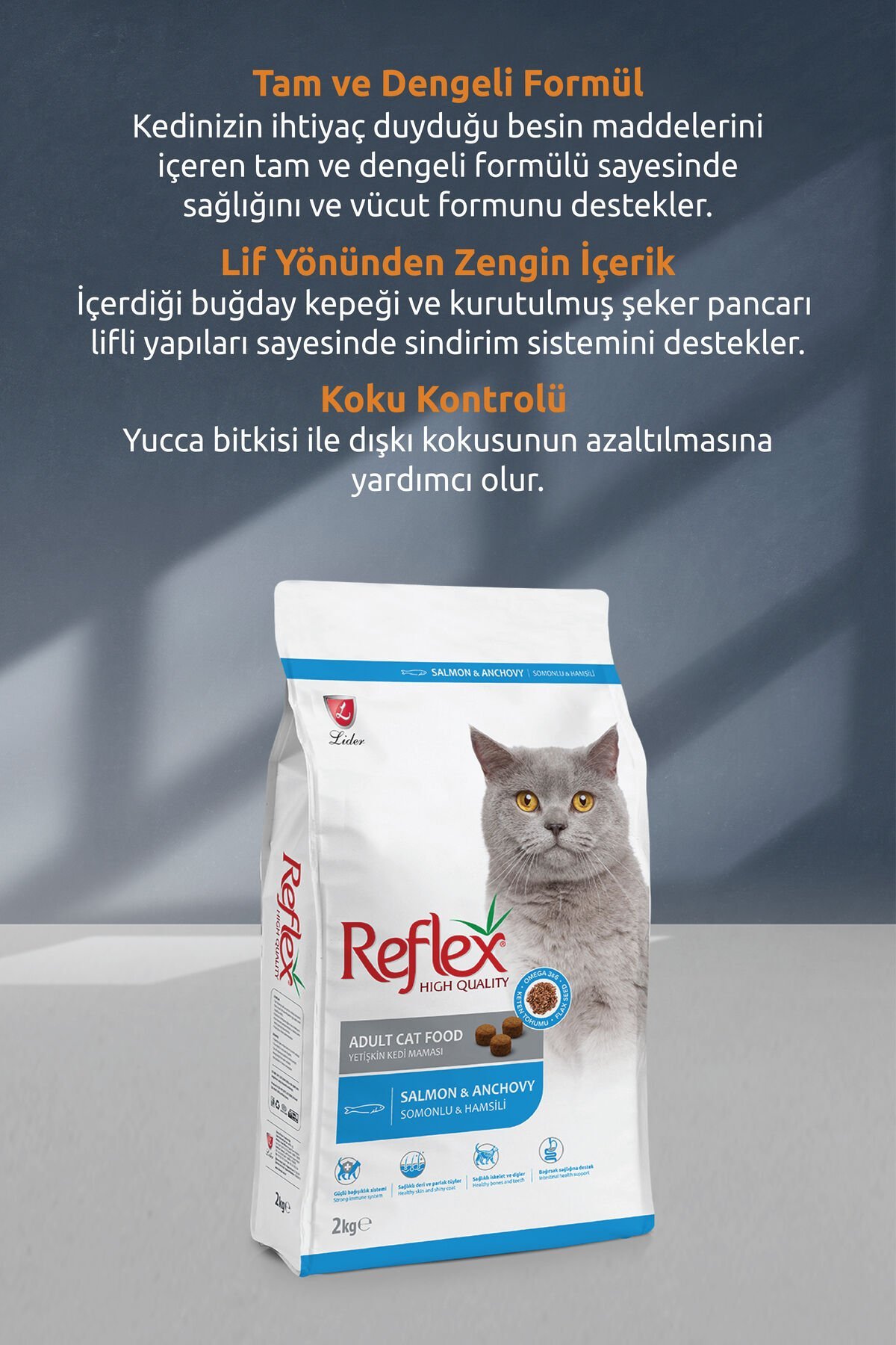 Reflex Somonlu ve Hamsili Yetişkin Kedi Maması 2 kg;Son kullanma tarihi ve parti no ambalaj üzerindedir.;Kuru ve serin bir ortamda paketin ağzı kapalı olarak muhafaza ediniz.;Ürününüzü direkt güneş ışığına maruz bırakmayınız.;Kuru mamanın yanında kedinizin su kabında daima temiz içme suyu bulundurunuz.;İnsan gıdası olarak kullanılmamalıdır.
