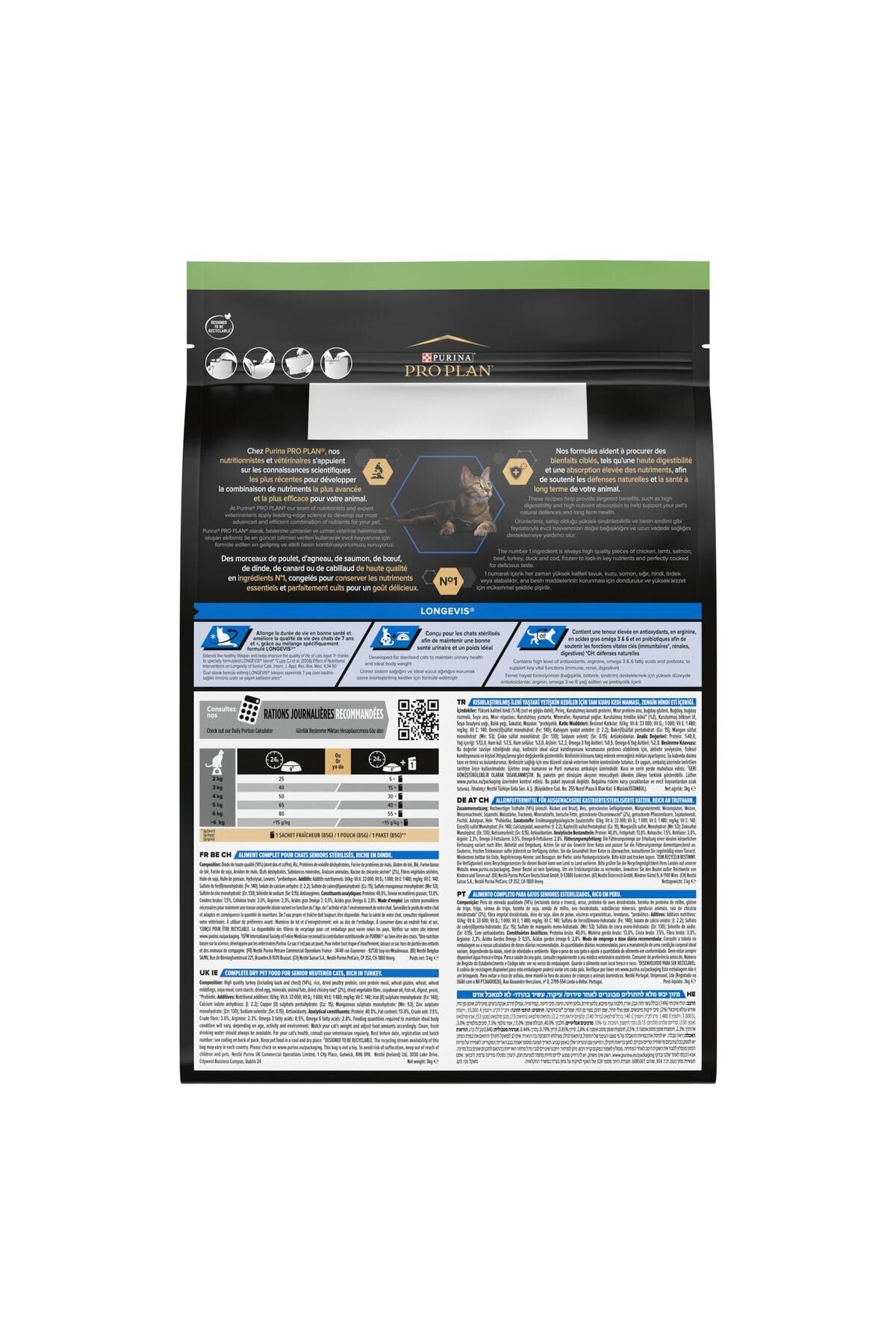 Pro Plan Sterilised Senior+7 Hindi-Tavuk Kısırlaştırılmış Kedi Maması 3 kg Purina Pro Plan Sterilised Adult 7+ Longevis Rich in turkey Kısırlaştırılmış 7 yaş üzeri kediler için özel olarak formüle edilmiş hindili tam kuru kedi maması 3 kgSterilize edilmiş 7 yaş üzerinde kediler için formüle edilmiş tam kuru kedi maması.; Longevis ile Purina Pro Plan Sterilised 7+, yaşlı kedilerde uzun süreli sağlığı desteklemek için gerekli olan tüm besin maddelerini içerir.; Sağlıklı kilonun korunmasına yardımcı olmak için Yağ oranı düşüktür, aynı zamanda sağlıklı yaşam süresini uzattığı kanıtlanmış bir besin karışımını da içerir.; Formül, yaşlı sterilize kedilerde sağlıklı yaşlanmayı desteklemek için ustaca dengelenmiştir.; Antioksidanlar, Prebiyotik, omega-3 ve omega-6 Yağ asitleri içeren eşsiz bir besin karışımı olan Longevis içerir.; Longevis'in 7 yaş üstü kedilerde sağlıklı yaşam süresini uzattığı ve yaşam kalitesini artırdığı kanıtlanmıştır.; * Daha sağlıklı ve uzun bir yaşam için LONGEVIS içerir.; * Sağlıklı bir vücut ağırlığının korunmasına yardımcı olur.; * Anahtar hayati fonksiyonları (bağışıklık, böbrek, sindirim) destekler.; * Kısırlaştırılmış kedilerde idrar sağlığını korur.; Analiz Değerleri :Ana besin değerleriNem: 6%Protein: 40%Yağ: 13%- Omega-6 Yağ Asitleri: 3.0%- Omega-3 Yağ Asitleri: 0.5%Karbonhidrat: 32%Ham lif: 3%Kalsiyum: 0.9%Fosfor: 0.8%Vitamin A: 22810 IU/kgVitamin D3: 1195 IU/kgTaurin: 2713 mg/kgVitamin E: 1270 IU/kgMetabolik enerji (ME): 1 3.6 kcal/gBeslenme Tablosu :Vücut ağırlığı (kg) g / gün (7-11 yaş arası) g / gün (12 yaş üstü)2-4 30-55 45-654-6 55-85 65-1006-8 85-115 100-135